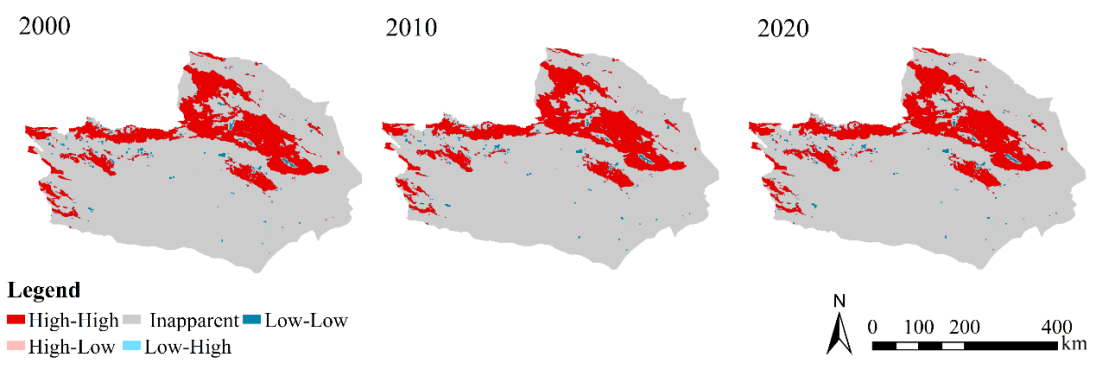 在过去 20 年中,区域碳储量先上升后下降。具体而言,从 2000 年到 2010 年,碳储量增加了 0.74×106t,但从 2010 年到 2020 年,碳储量 减少了1.37×106t。分析表明,城市无序扩张导致碳储量下降,而合理利用未利用土地则提高了碳储量。空间自相关分析显示碳储量具有很强的空间相关性,该时期的Moran指数分别为0.859、0.86和0.856。利用Geoda软件,局部空间自相关分析生成碳储量聚类分布图。高-高集群,表明碳储量水平较高,主要集中在西北和中部地区,以草地和林地为特征。低-低集群,表明 碳储量水平较低,主要出现在建设用地和水域。